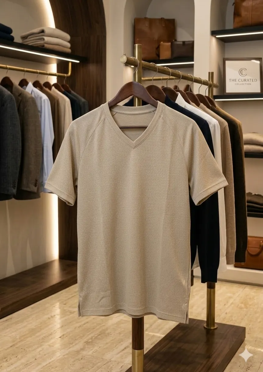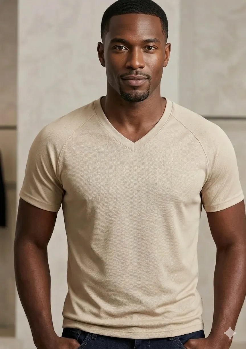 This beige V-neck T-shirt is of excellent fabric,featuring a textured finish. The soft fabric ensures comfort, making it perfect for casual outings or relaxed days at home. Its versatile color makes it easy to pair with various bottoms. Ideal for anyone looking to enhance their wardrobe with a chic yet comfortable piece.